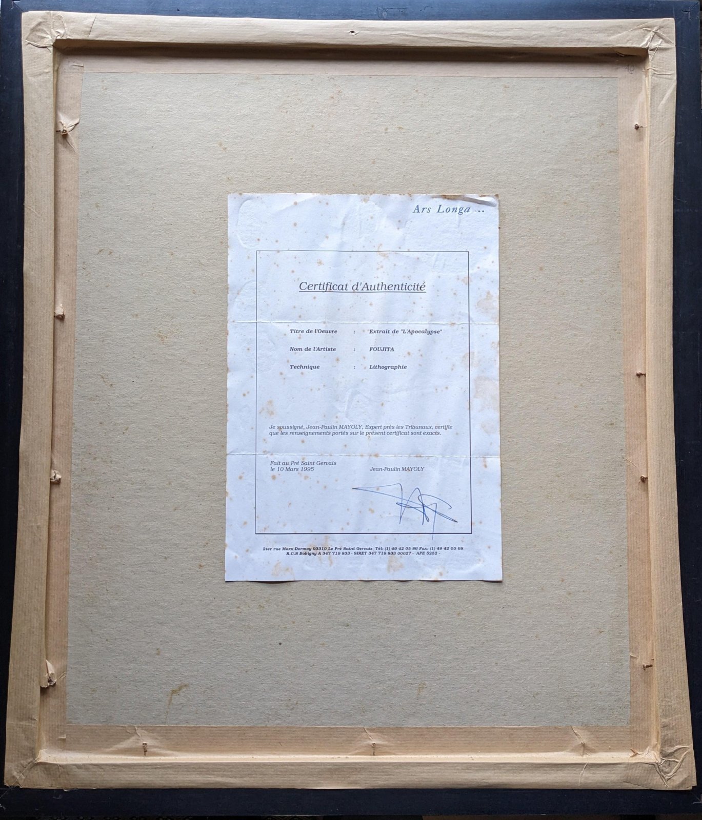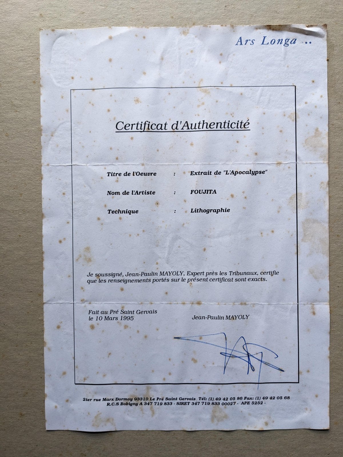 藤田嗣治 大判リトグラフ額入り「黙示録」の部分・地獄図 40×32cm 藤田嗣治 大判リトグラフ額入り「黙示録」の部分・地獄図 40×32cm 仏文鑑定書付き これは1961年に完成したビュッフェ、ダリ、藤田嗣治ほか7人の画家の挿絵による仏文「黙示録」のうち藤田が担当した絵の部分図です。原本の目方は210キロで世界一重い本として有名です。額入りです。 他の写真 額の裏面 仏文の鑑定書 藤田嗣治 大判リトグラフ額入り「黙示録」の部分・地獄図 40×32cm 販売価格: 165,000円(税込) 在庫数1点 Tweet 数量: 1 返品特約に関する重要事項 お問い合わせ お気に入り登録